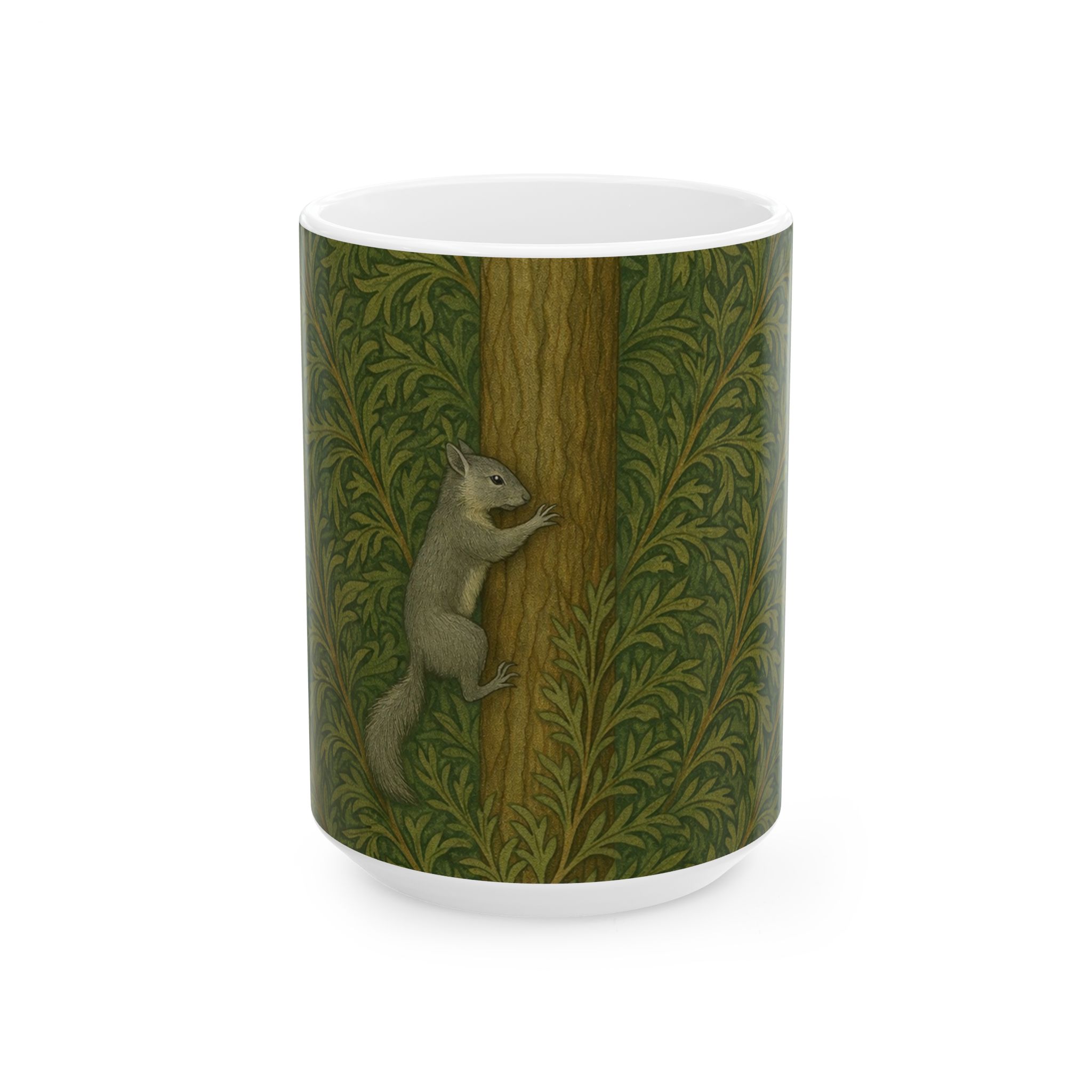 Woodland Squirrel Mug – William Morris-Inspired Forest Pattern (15 oz)