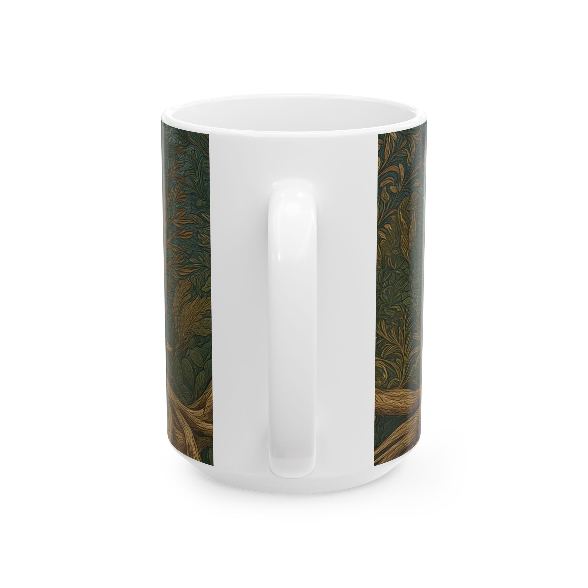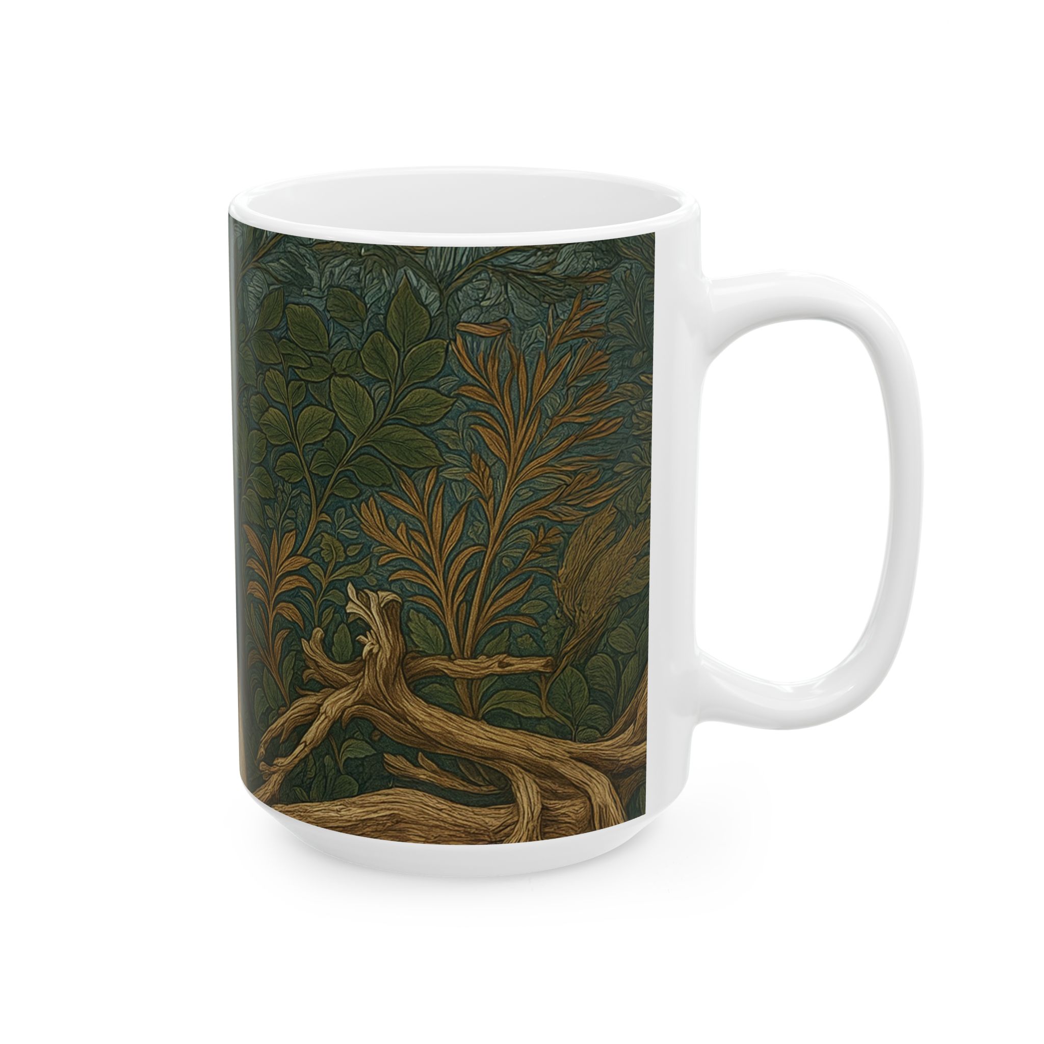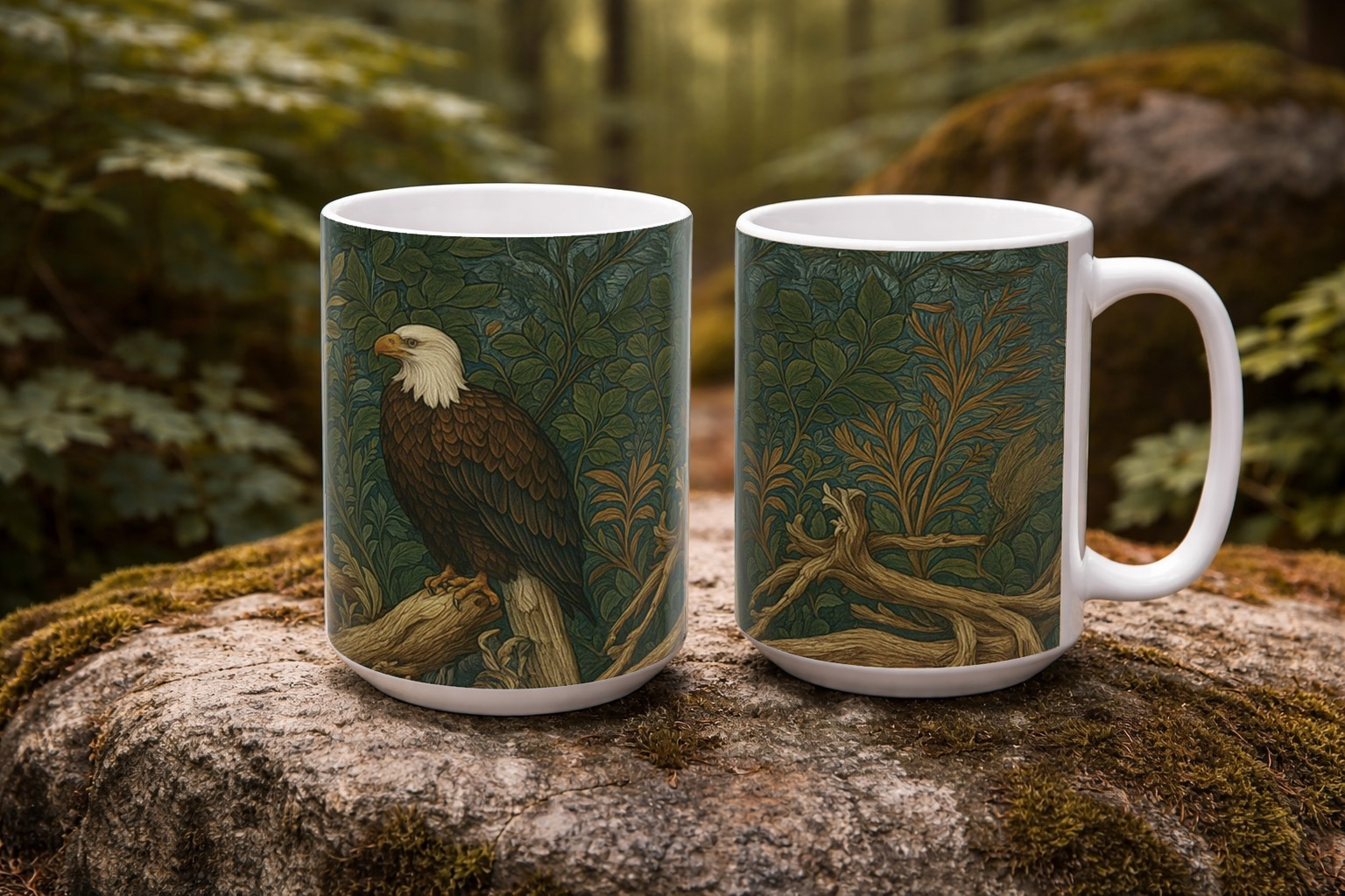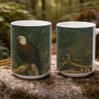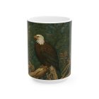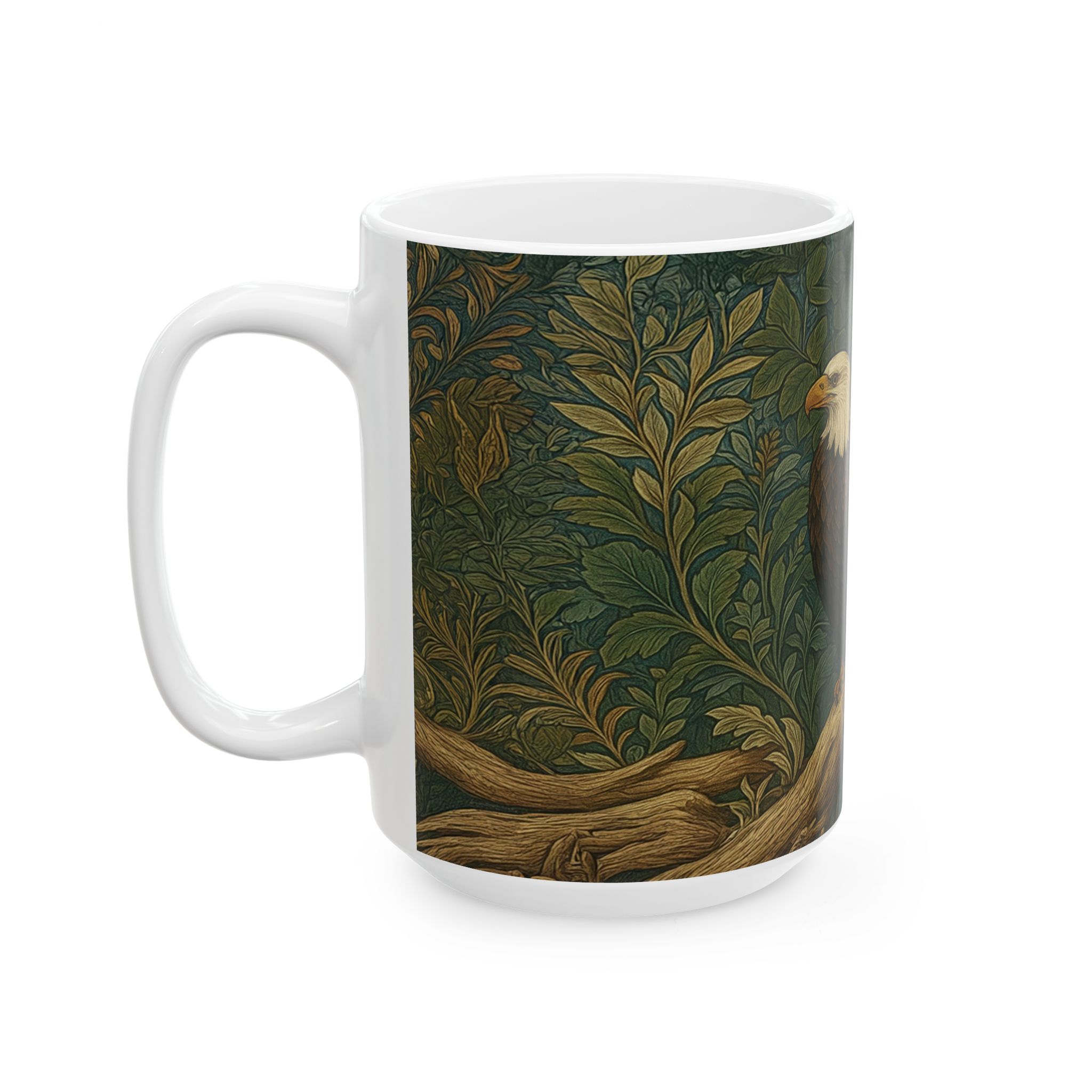 This mug features a stately bald eagle perched on weathered driftwood, set against a richly patterned backdrop inspired by the Arts & Crafts tradition of William Morris. The illustration is intentionally flat and surface-driven, with subtle grain and organic botanical patterning that echo historic wallpaper designs while keeping the eagle as the quiet focal point.