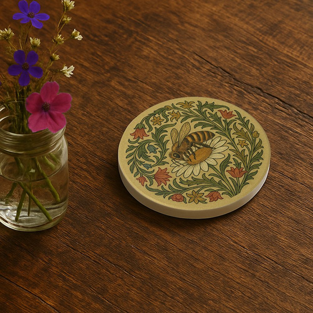 This illustrated coaster features a honey bee poised over a classic white daisy, rendered in the refined style of the Arts & Crafts movement. Inspired by the natural rhythms and botanical precision of William Morris textiles, the design combines flowing foliage, soft earthy tones, and intricate linework to create a timeless, harmonious composition.