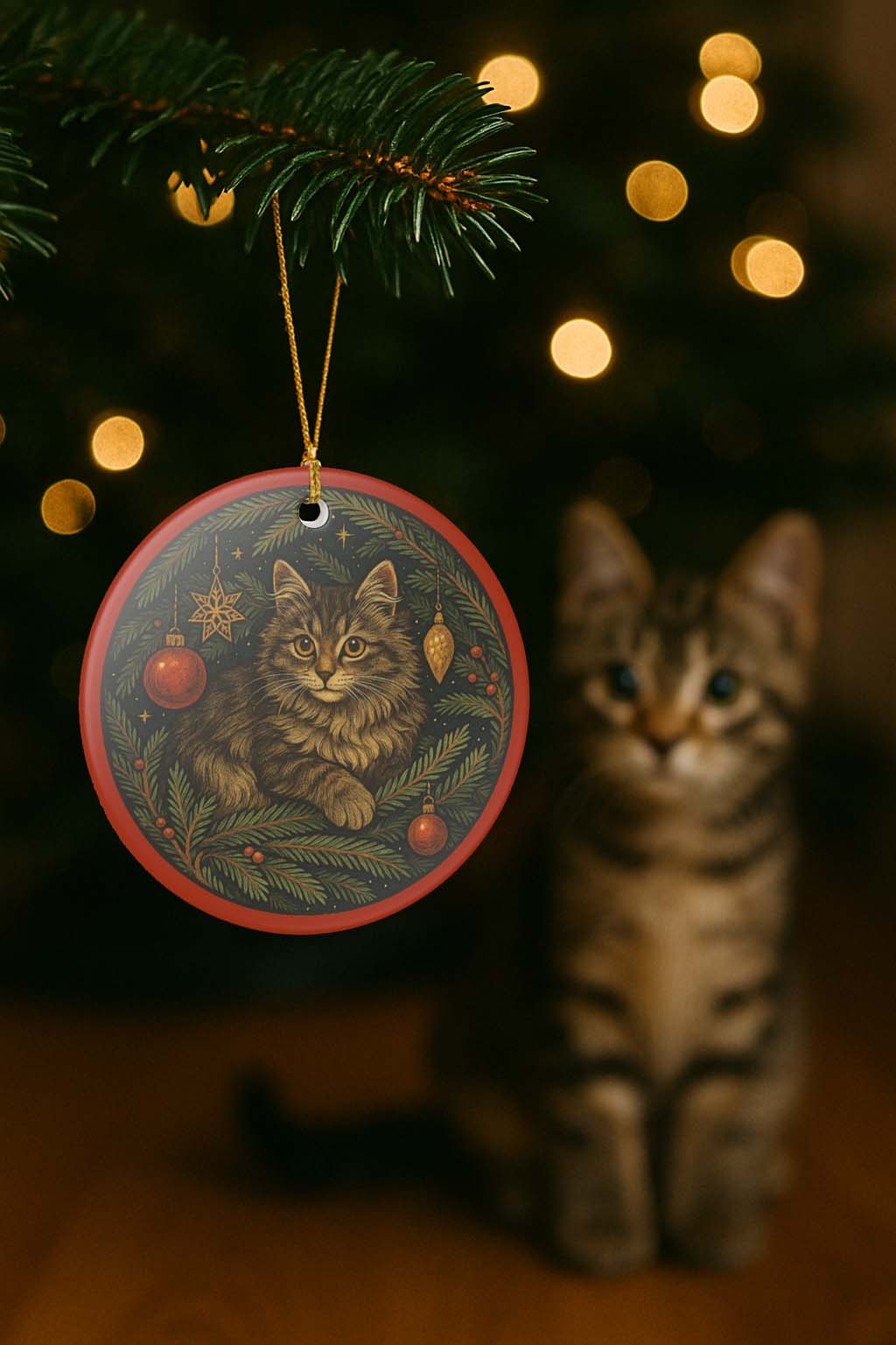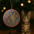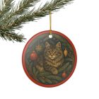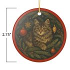 A hand-painted feeling ceramic ornament that brings a quiet, cozy moment to your tree. The round ornament shows a soft, wide-eyed kitten cradled in evergreen boughs, detailed holly berries and vintage-style brass baubles. The glossy white ceramic provides a luminous backdrop while the matte-printed artwork keeps the image soft and collectible. Hung from the included gold string, it sits neatly among warm lights and wooden decorations, evoking slow evenings, a cat’s gentle company, and a home that treasures small, timeless details.
