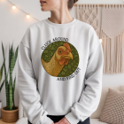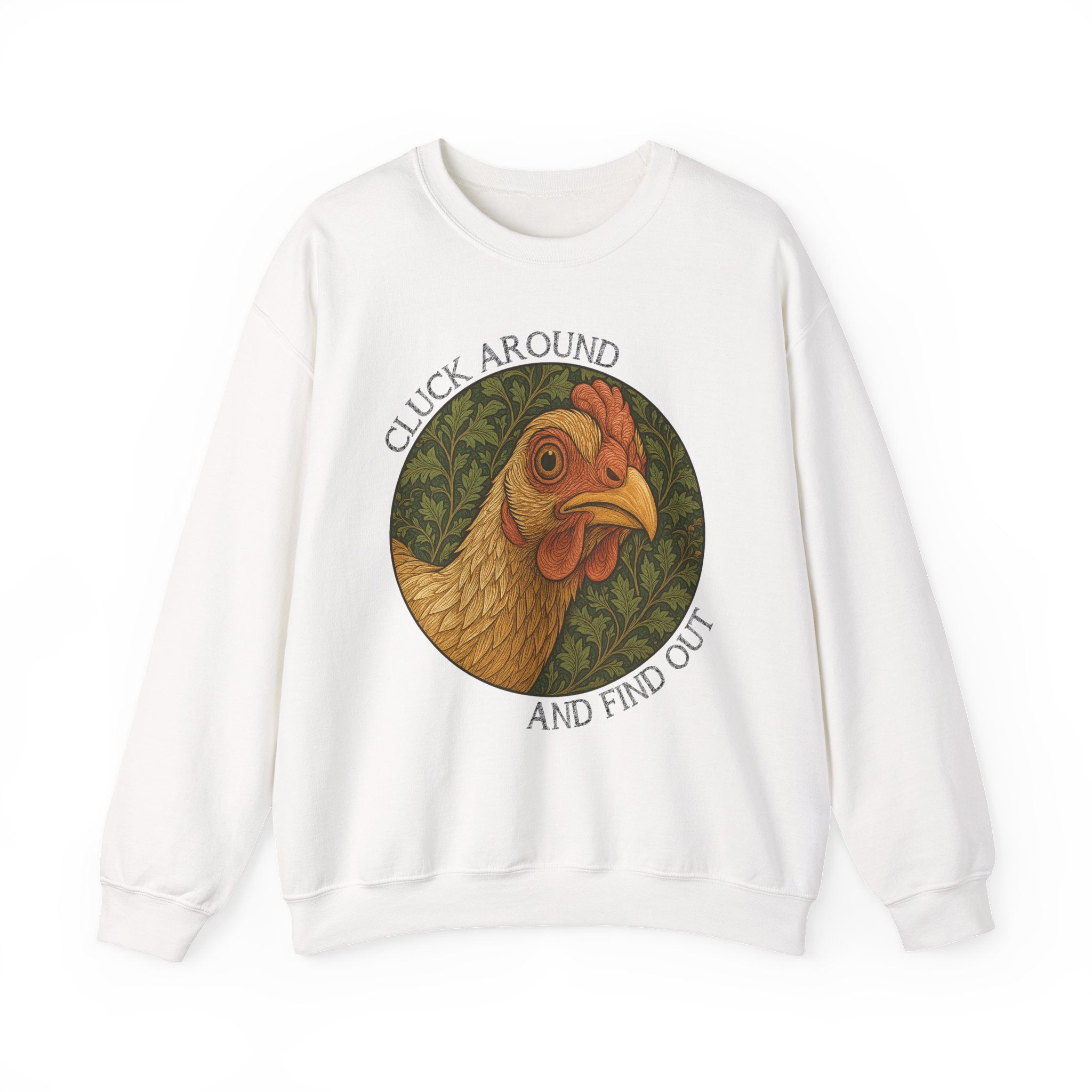Equal parts cozy and unapologetically bold, the Cluck Around and Find Out sweatshirt is for anyone who appreciates good design—and a little poultry-powered attitude. Featuring a richly illustrated chicken inspired by Arts & Crafts and William Morris–style foliage, this design blends classic decorative detail with modern humor.