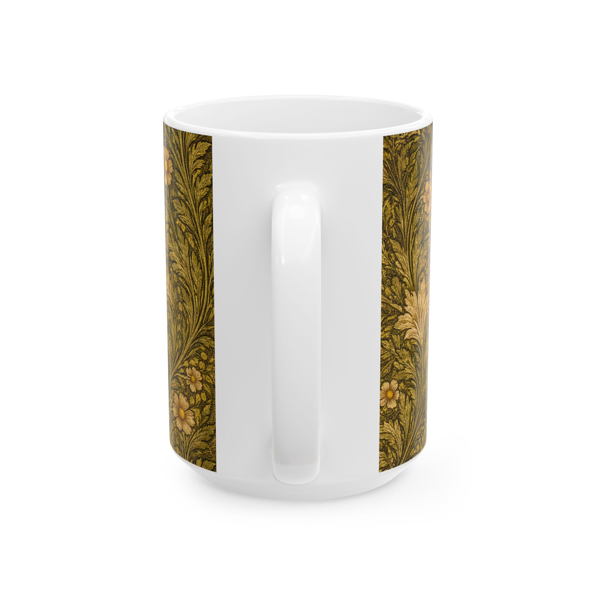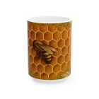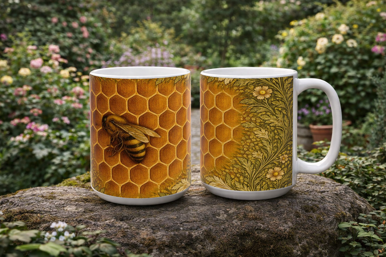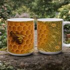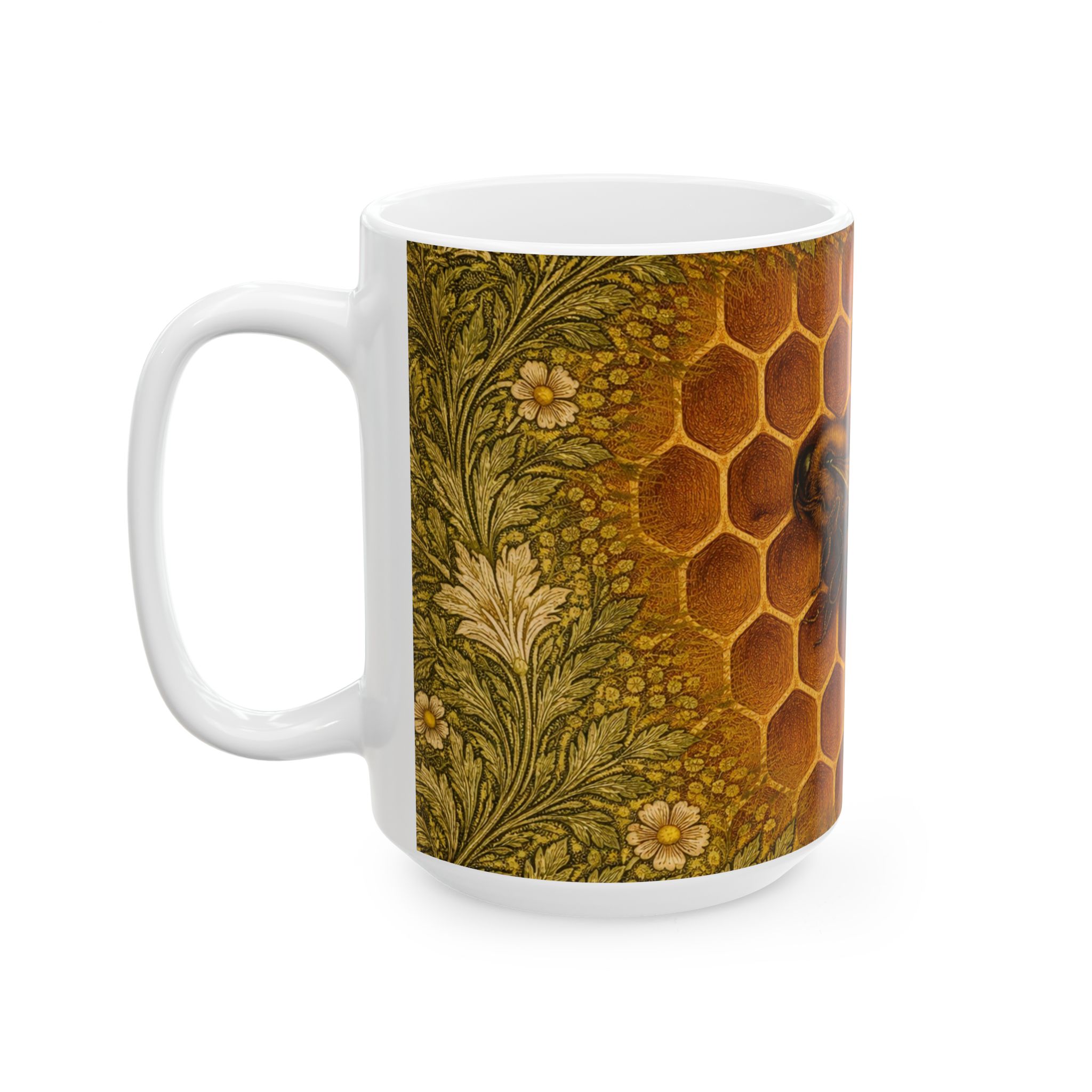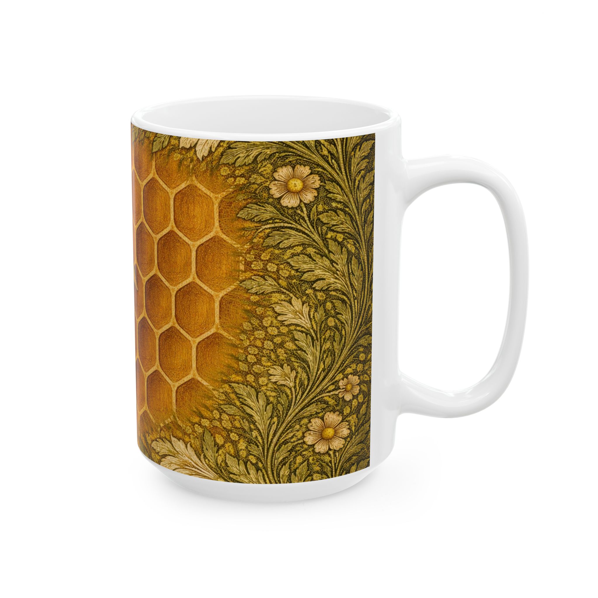 Warm, intricate, and quietly luminous, this mug features a honeybee nestled into a glowing honeycomb, illustrated in an Arts & Crafts–inspired style. The bee peers gently into the comb, surrounded by golden hexagons that soften organically into flowing botanical patterns at the edges. Leafy vines and small blossoms echo classic William Morris design while keeping the composition natural and unfussy. Rich amber tones and textured greens make this mug feel cozy and timeless—perfect for morning coffee, afternoon tea, or as a thoughtful gift for gardeners, beekeepers, and nature lovers.