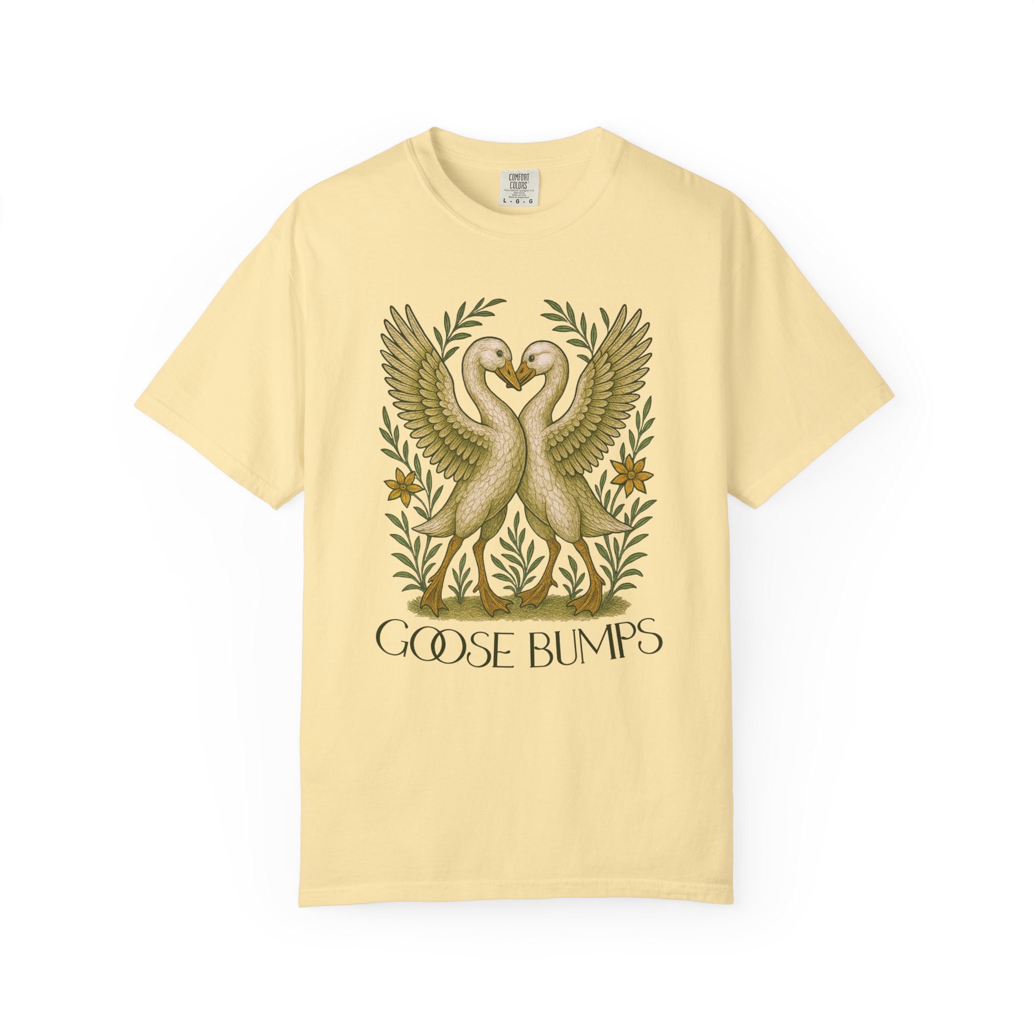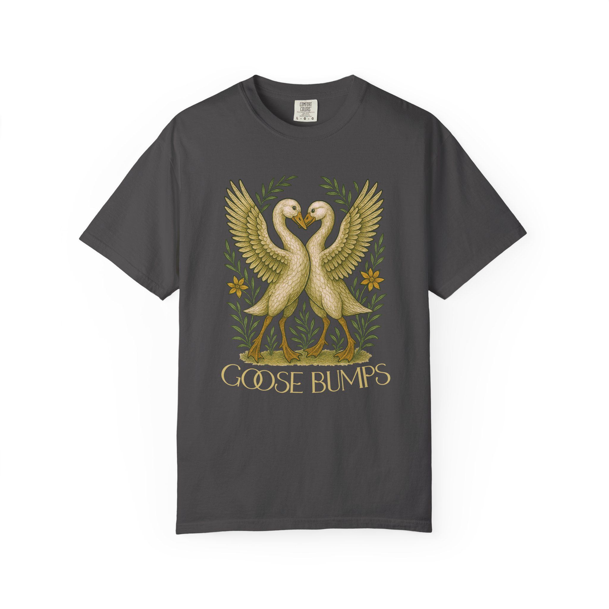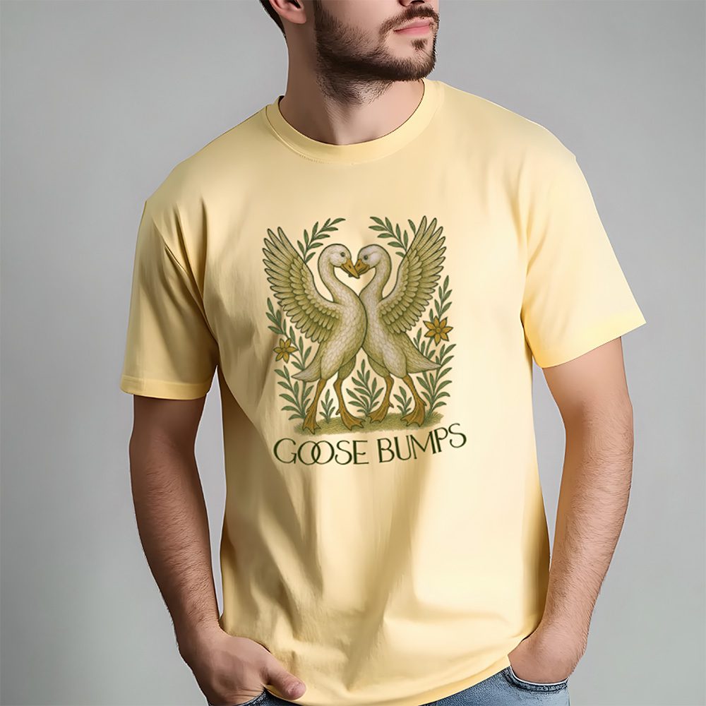 Camaraderie, whimsy, and a dash of feathered enthusiasm are on full display with the Goose Bumps tee. Illustrated in a richly detailed, William Morris–inspired style, this design features two exuberant geese mid–chest bump, surrounded by ornate Arts & Crafts foliage. The fine texture and warm natural palette echo classic vintage prints, while the playful moment at the center brings a modern wink of humor. Perfect for friends, couples, teammates, or anyone who appreciates clever wordplay wrapped in beautifully crafted art.