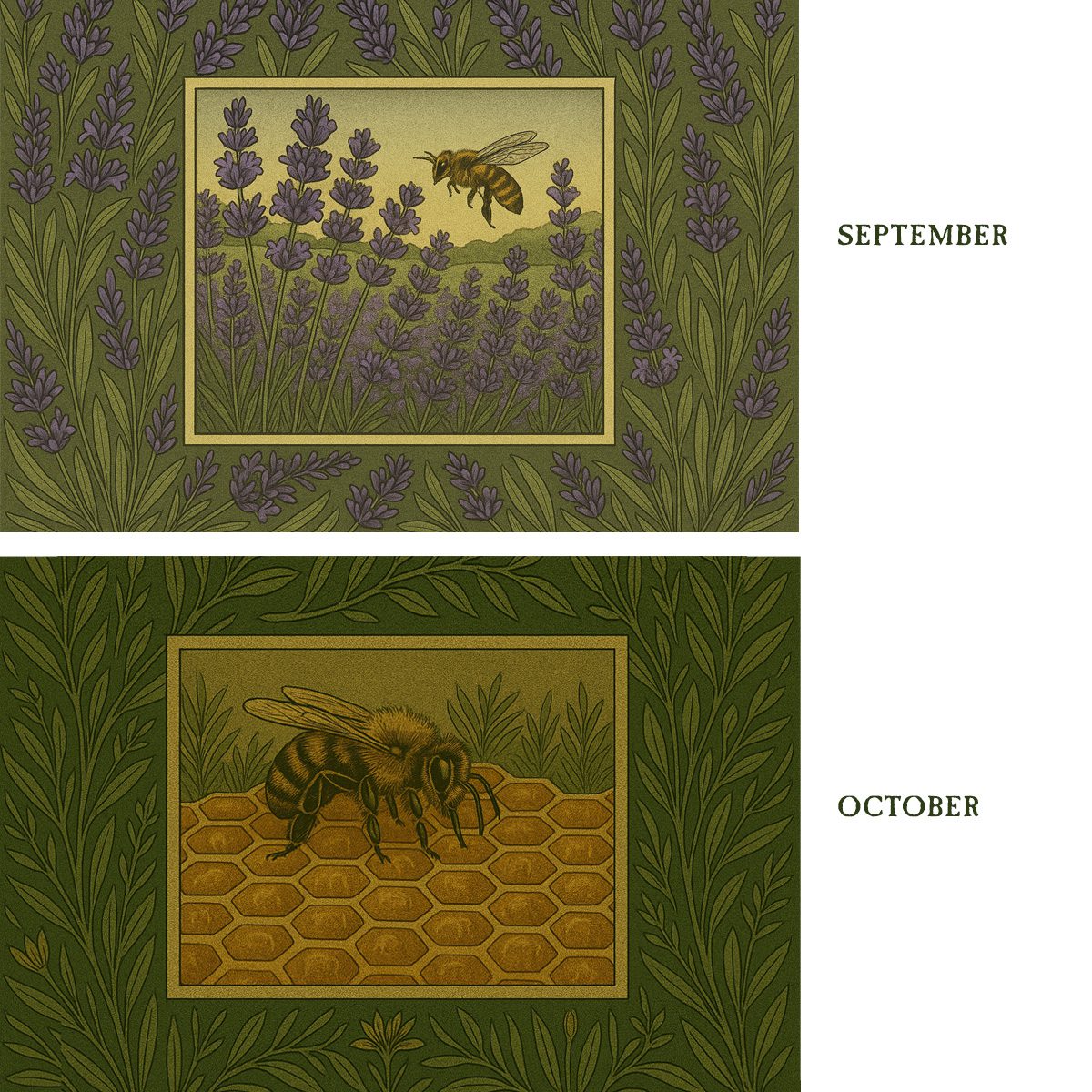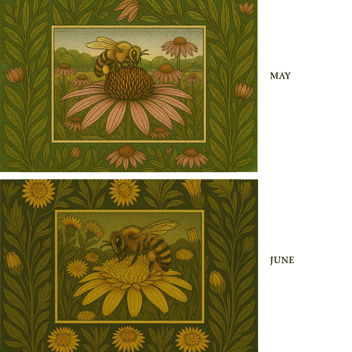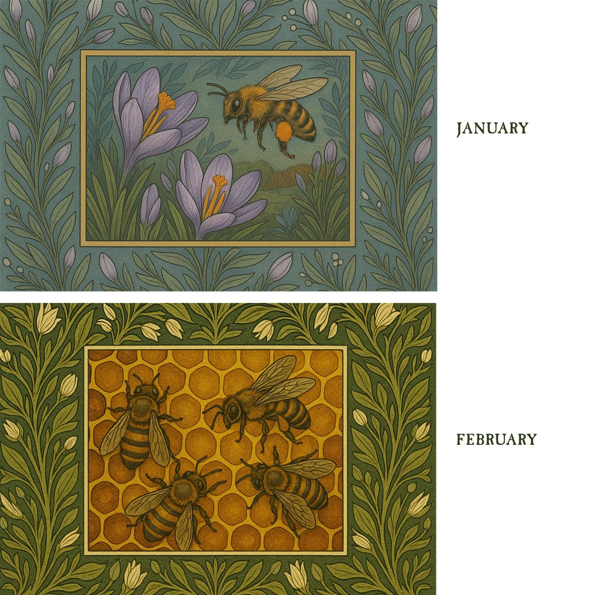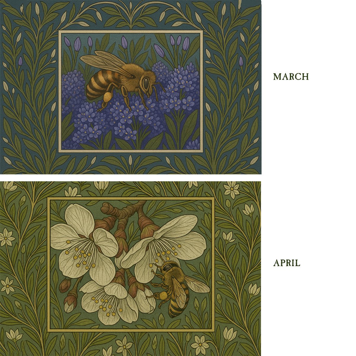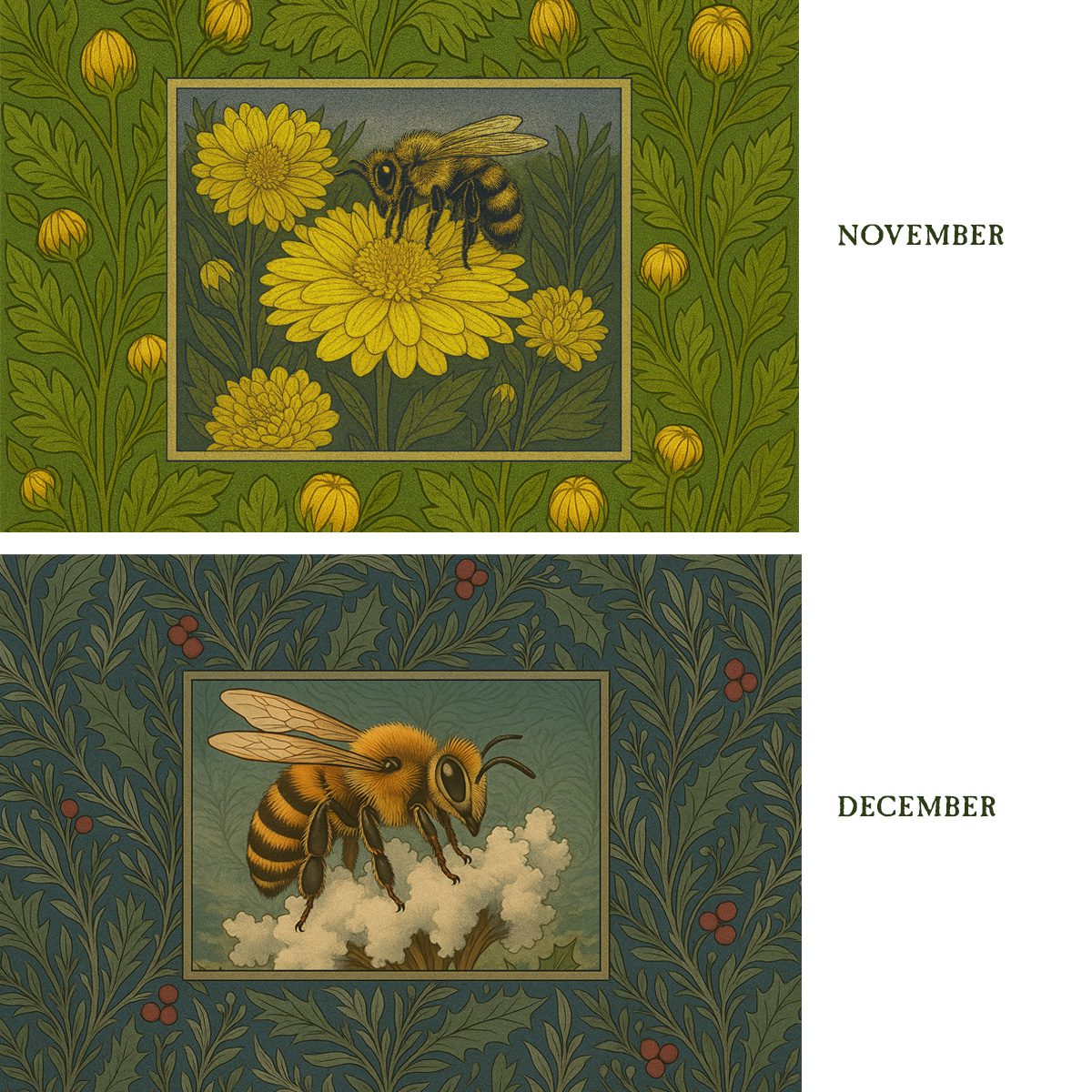 Each month showcases a different real-world honey bee scene—lavender fields, echinacea blooms, crocosmia, chrysanthemums, dandelions, and more—transformed into a cohesive Morris-style composition with elegant foliage wallpaper, warm palettes, and subtle textures.