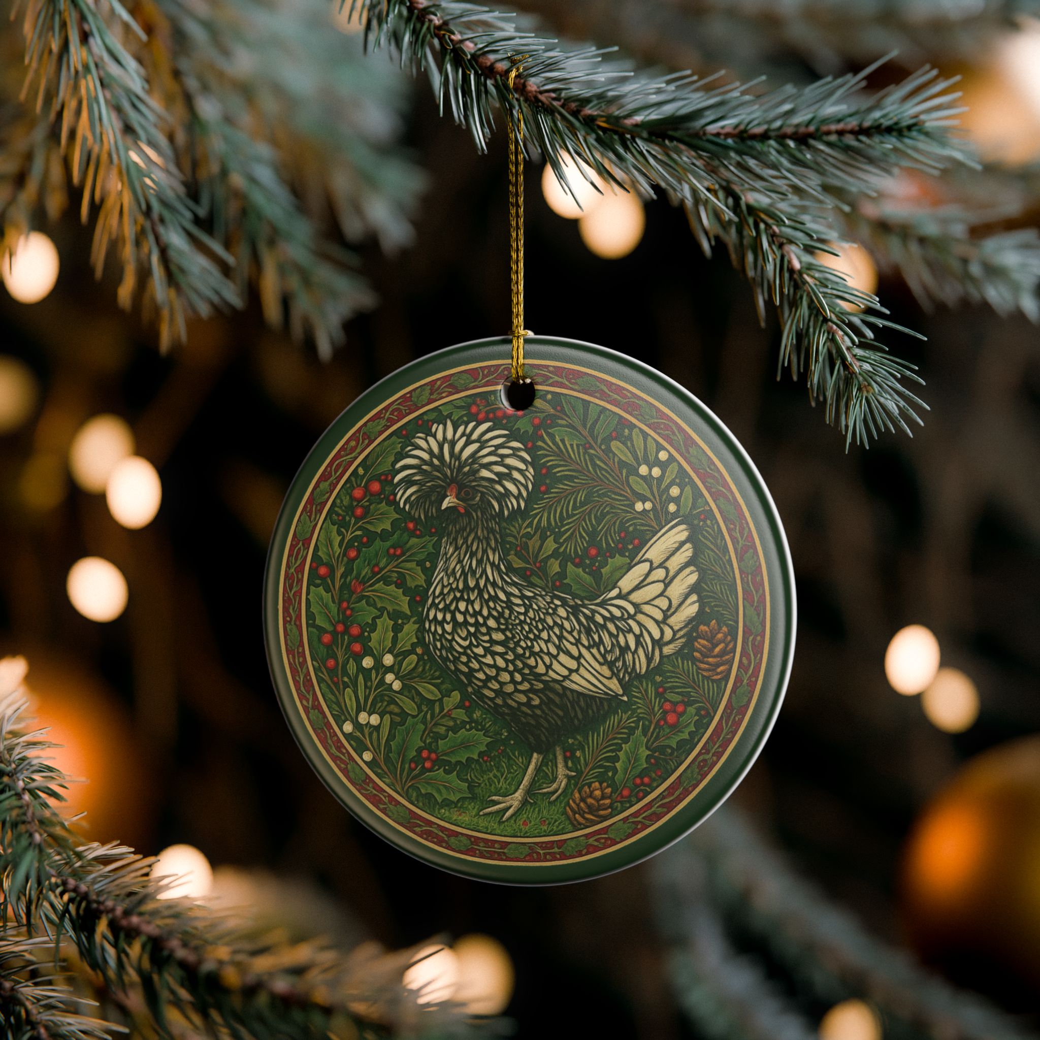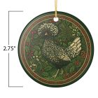 Handcrafted ceramic ornament with an old-world botanical chicken design. The rich forest-green border, delicate foliage, and pinecone accents give it a quietly nostalgic feel — like a page torn from a cottage garden sketchbook. Lightweight yet sturdy, it hangs from the included gold string and shows the illustration on both sides with a glossy body and soft matte print finish. Tuck it into a holiday display, hang it from a kitchen peg, or add it to seasonal wreaths to bring a touch of rustic charm and calm storytelling to the room.