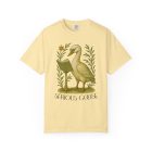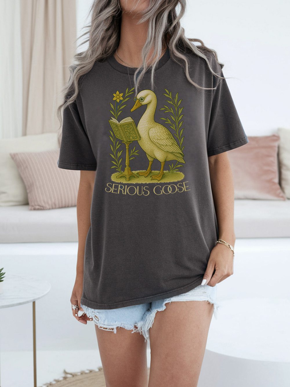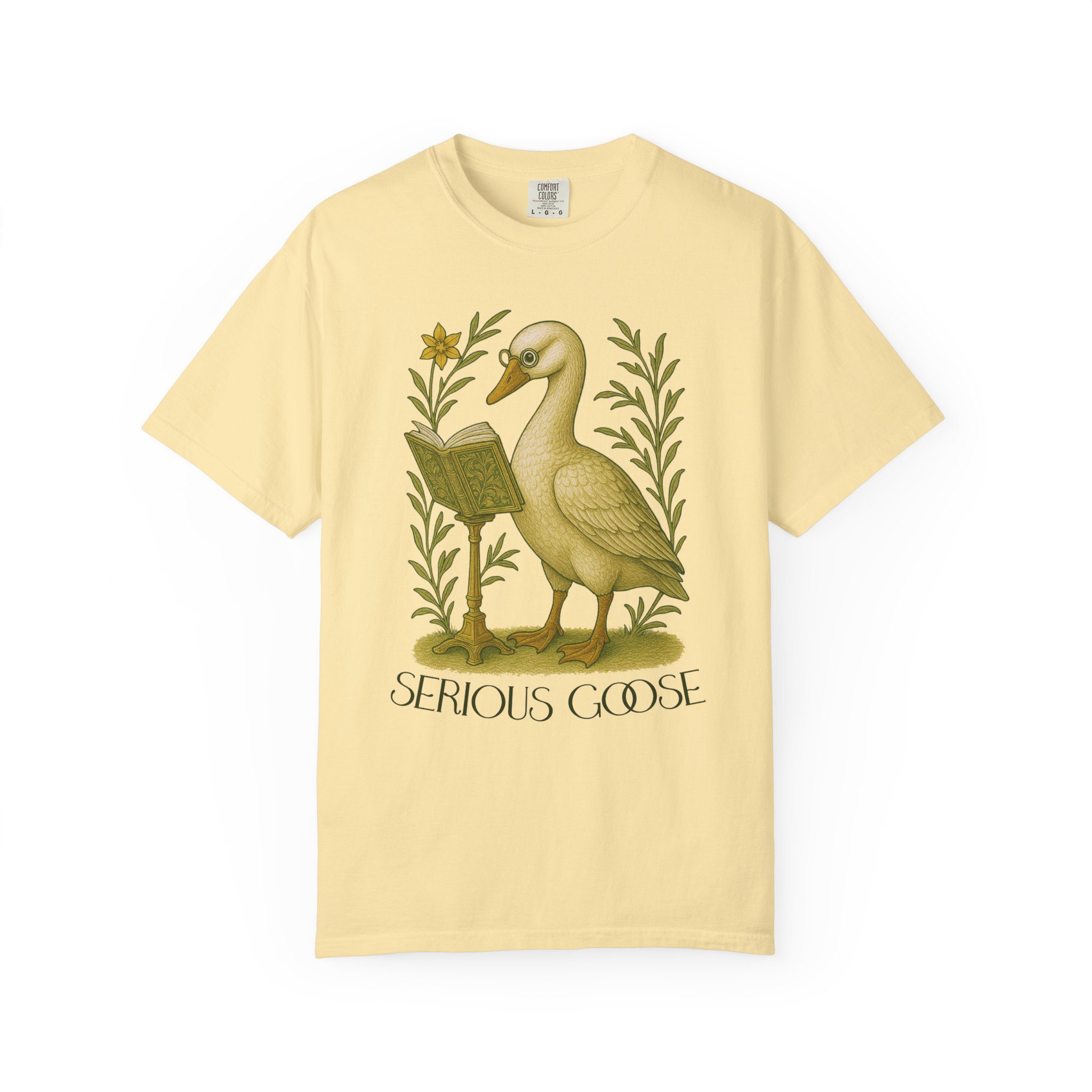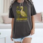 Soft, lived-in comfort meets quiet humor. This garment-dyed tee carries a vintage-inspired illustration of a studious goose beneath the words “SERIOUS GOOSE.” The muted, antique tones and slightly faded finish feel like a favorite thrift shop find from day one. Wear it to slow mornings with coffee, long walks through town, or casual study sessions — the relaxed fit and medium-weight cotton keep things easy and familiar. The understated, scholarly design slips into everyday wardrobes and pairs with denim, corduroy, or your comfiest lounge pants. It’s the kind of tee that sparks a smile and starts small conversations without shouting for attention.
