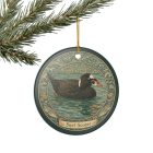 Muted ocean blues and greens keep the palette calm and timeless, while the circular composition gives the piece a classic medallion feel. A reserved banner space grounds the design and names the bird, making this ornament both decorative and educational.