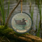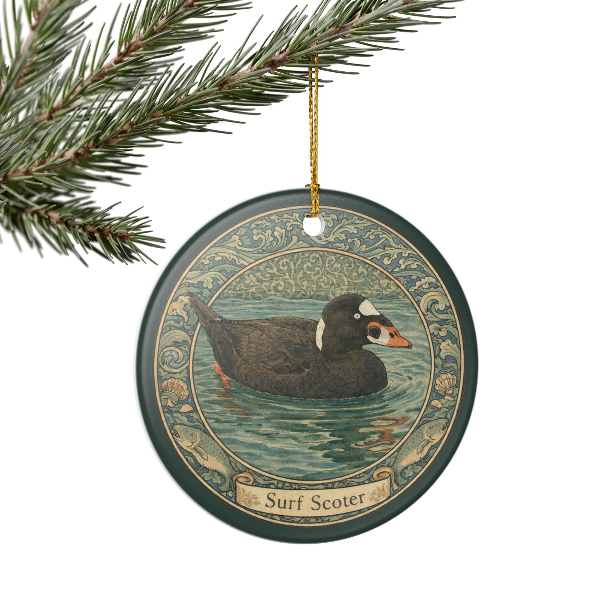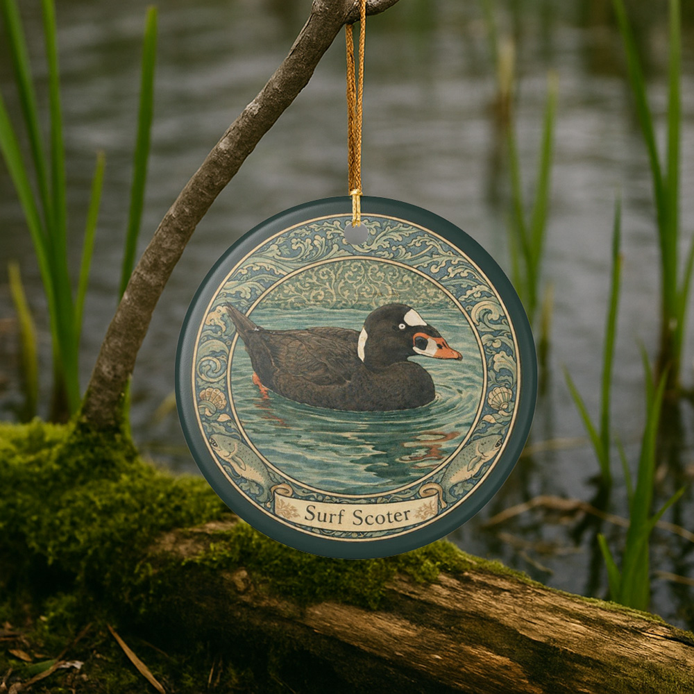 This Surf Scoter ornament features a hand-rendered illustration inspired by the flat, patterned beauty of William Morris designs. The bold sea duck floats in quiet coastal water, surrounded by subtle, rhythmic wave motifs that echo historic wallpaper traditions without becoming ornate or busy.
