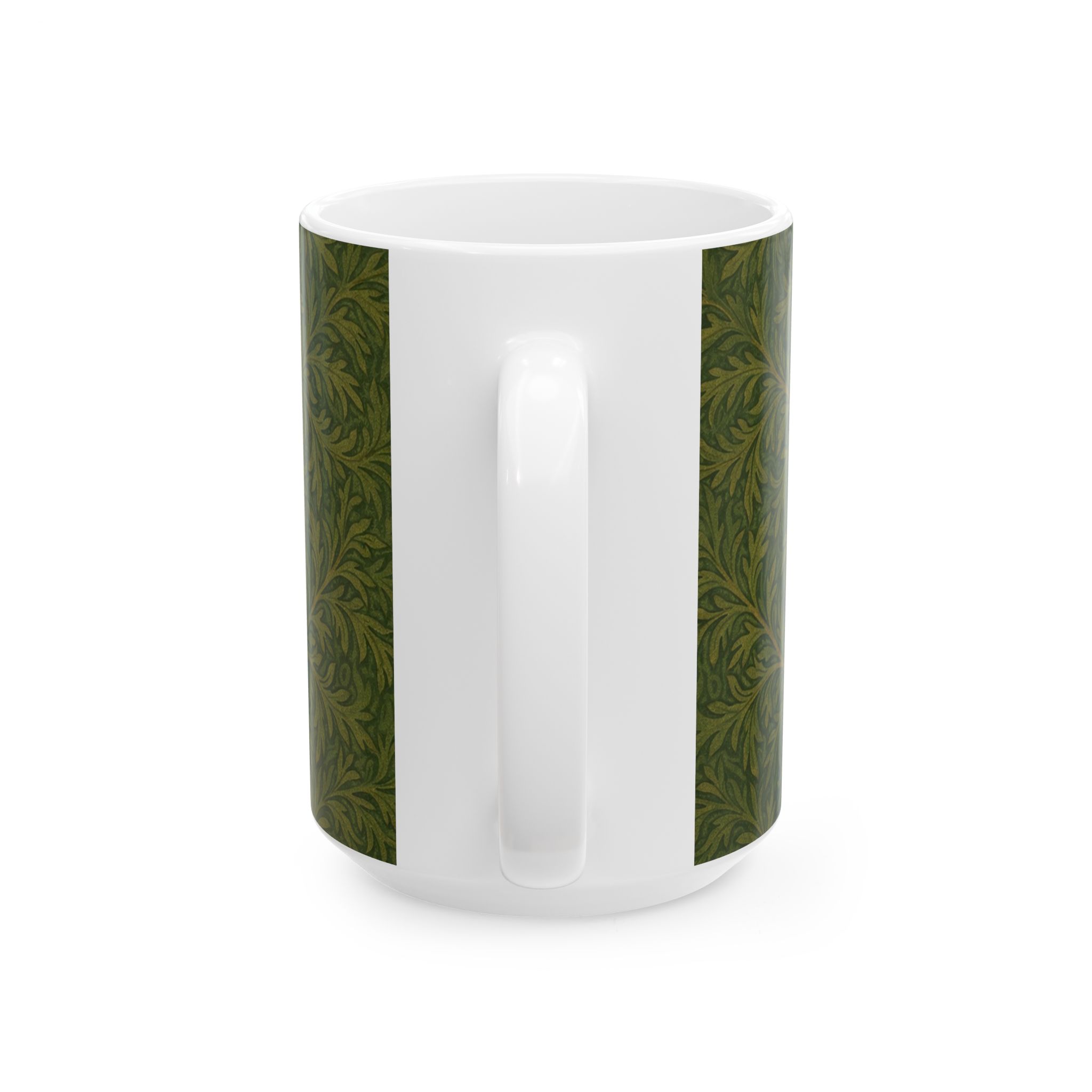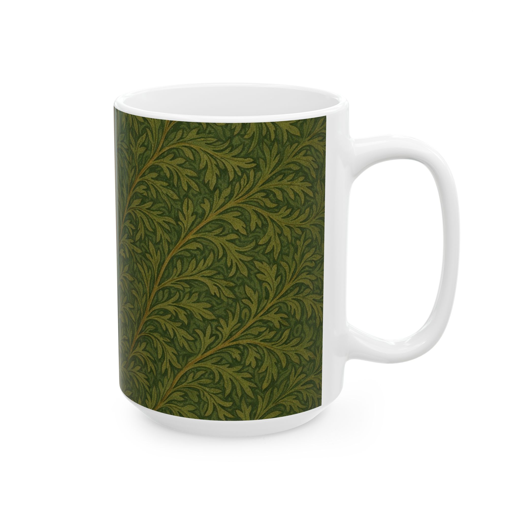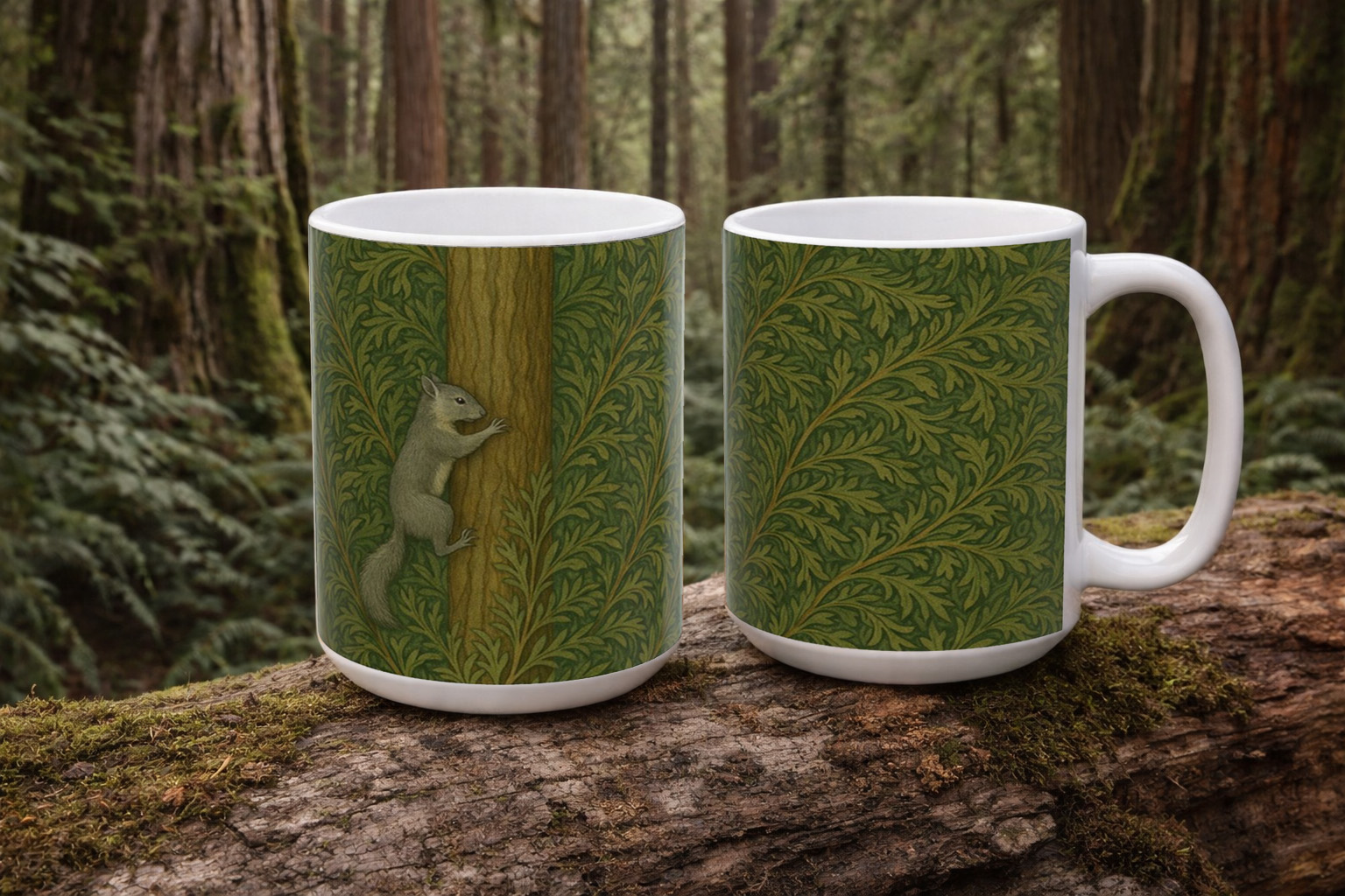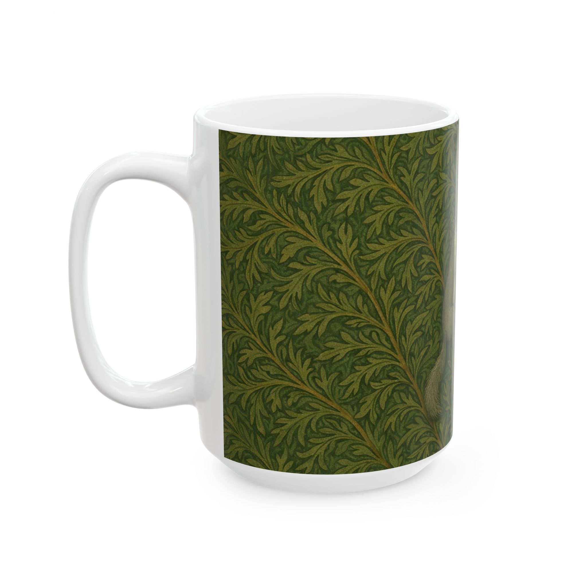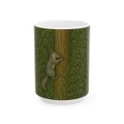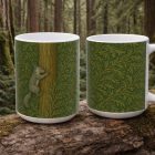 Bring a quiet bit of woodland charm to your daily ritual with this illustrated squirrel mug. Inspired by classic William Morris–style botanical patterns, the design features a small gray squirrel nestled at the center of flowing, leafy foliage. The flattened illustration style and subtle texture give it a timeless, handcrafted feel without overwhelming detail.