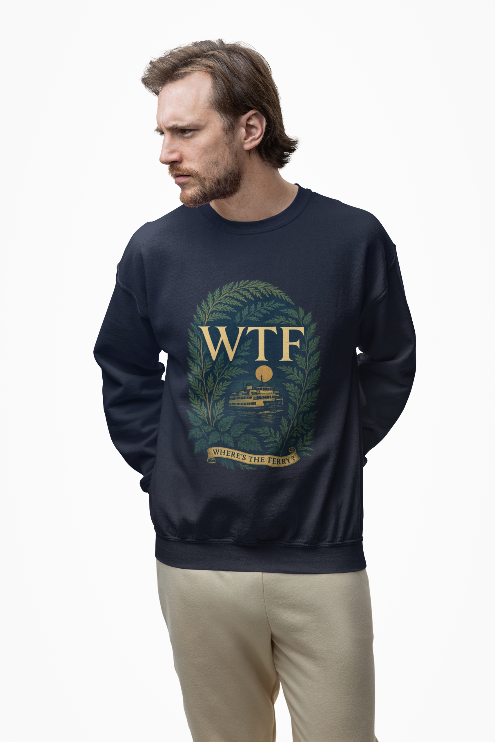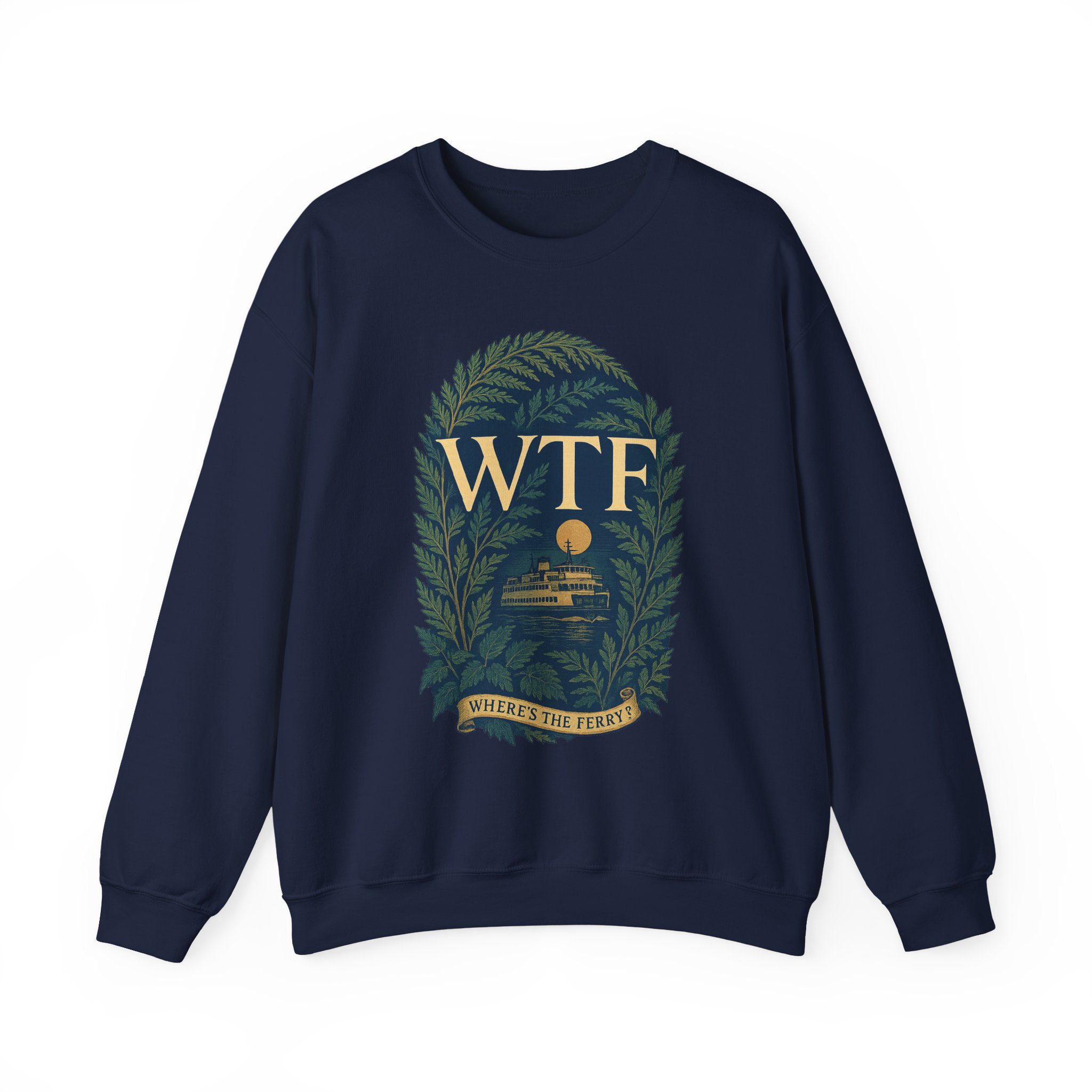 Printed on a cozy, midweight Gildan 18000 sweatshirt that’s soft, warm, and ready for breezy crossings, dockside bonfires, or standing in line at the terminal for 2 hours.
